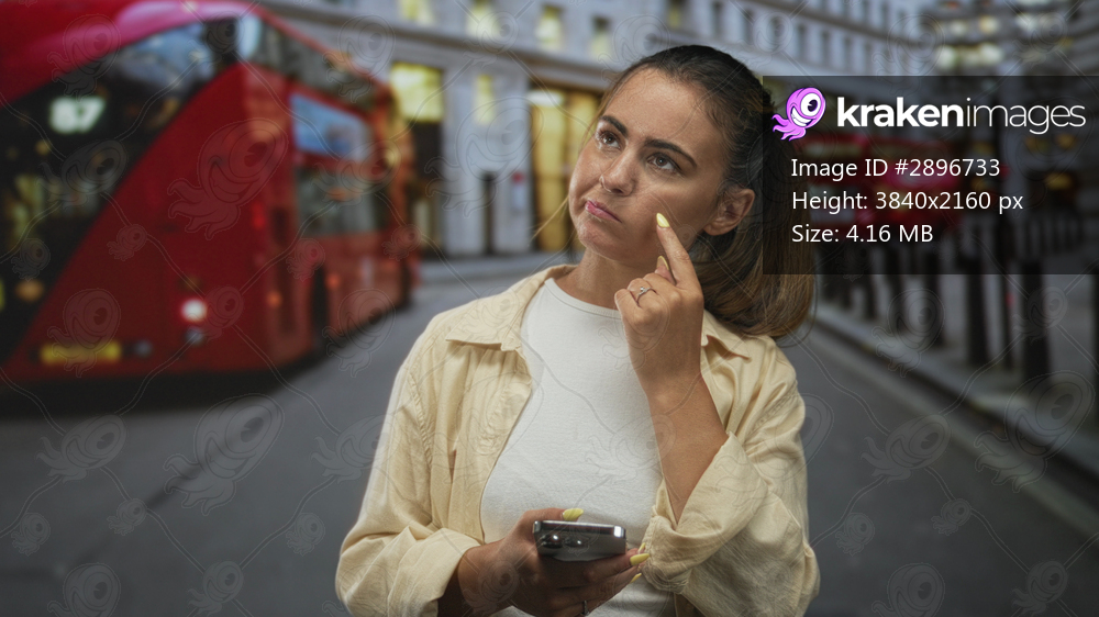 Woman texting on smartphone with hand to cheek, beige jacket and yellow nails, standing near red doubledecker bus on street; pensive reflection.