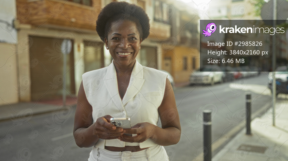 Woman texting on smartphone, hands visible holding device, wearing white sleeveless vest and cropped pants, standing on a street beside parked cars and bollards in warm sunlight; calm connection. - Kraken Images