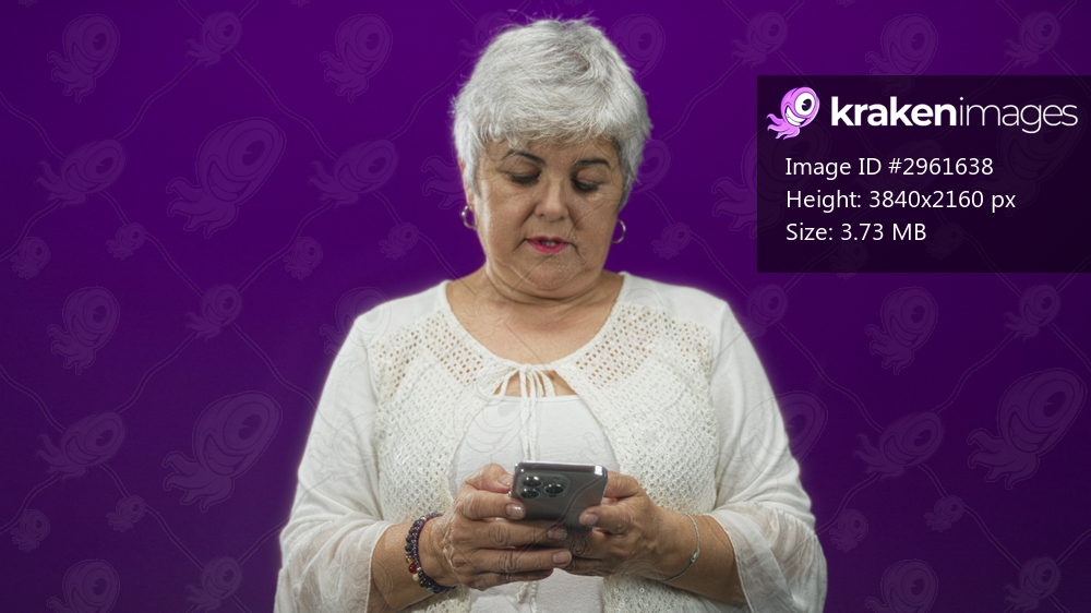 Woman texting on smartphone holding phone with both hands in studio in white blouse; calm concentration.