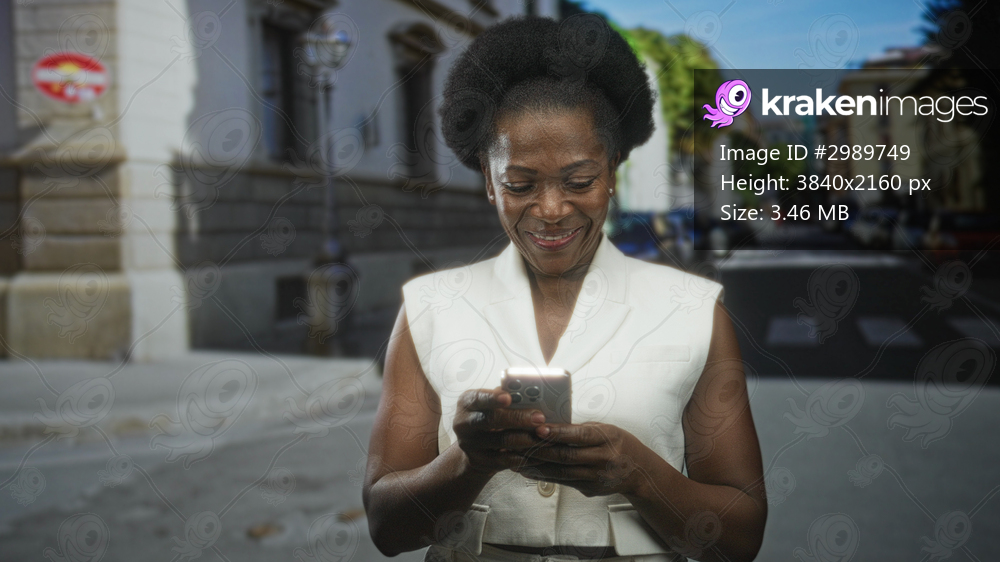 Woman texting on smartphone on a city street, wearing white sleeveless vest, hands holding device and smiling while standing near a crosswalk; serenity connection. - Kraken Images