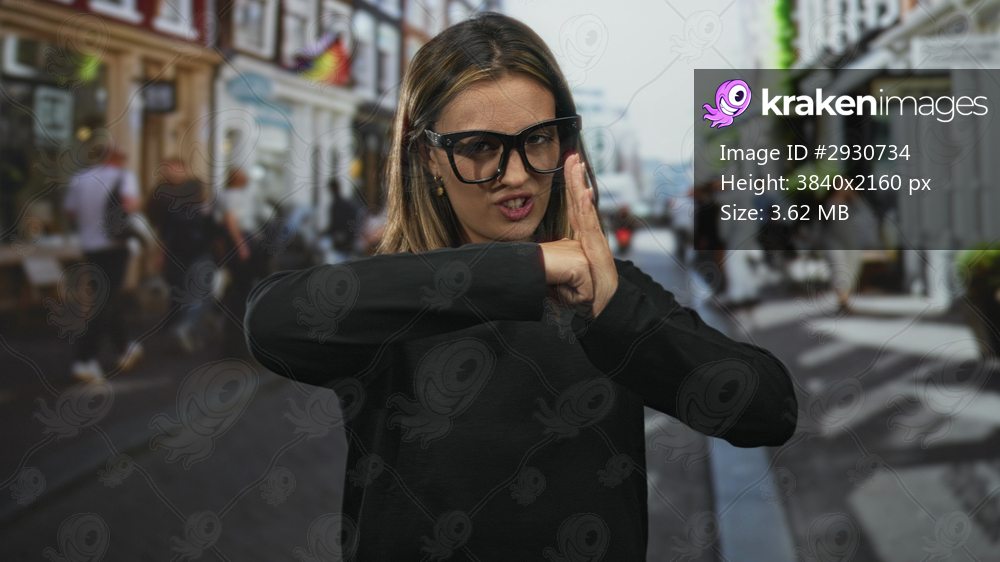 Woman with thick black glasses pressing palms together and grimacing while wearing black sweater on a busy cobbled street; urban defiance.
