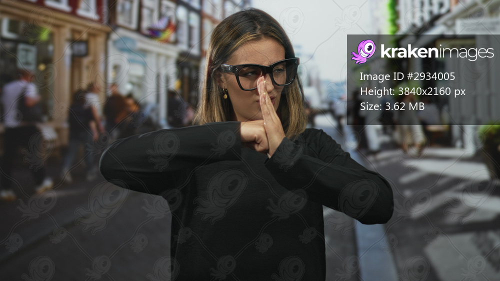 Woman with thick black glasses pressing palms together and grimacing while wearing black sweater on a busy cobbled street; urban defiance.