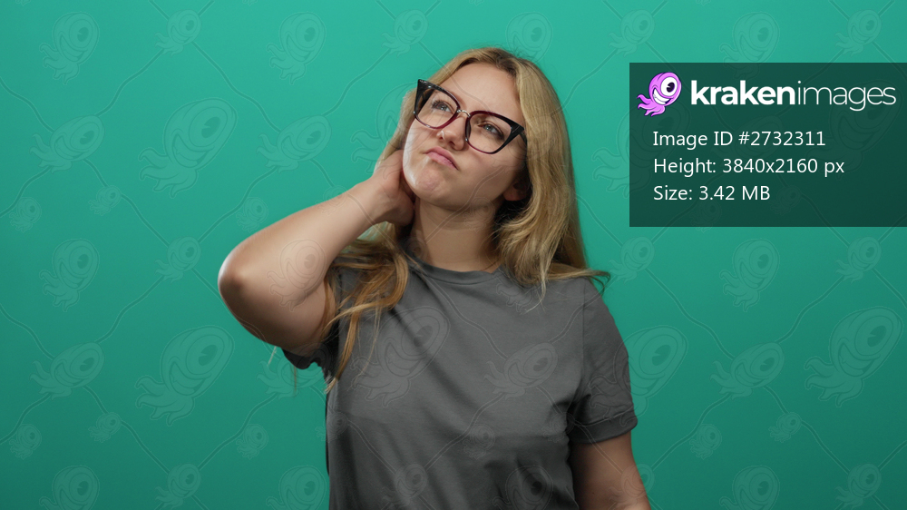 Woman thinking with a puzzled expression, blonde, wearing glasses, isolated against green wall background, suggesting curiosity and contemplation in a studio setting. - Kraken Images