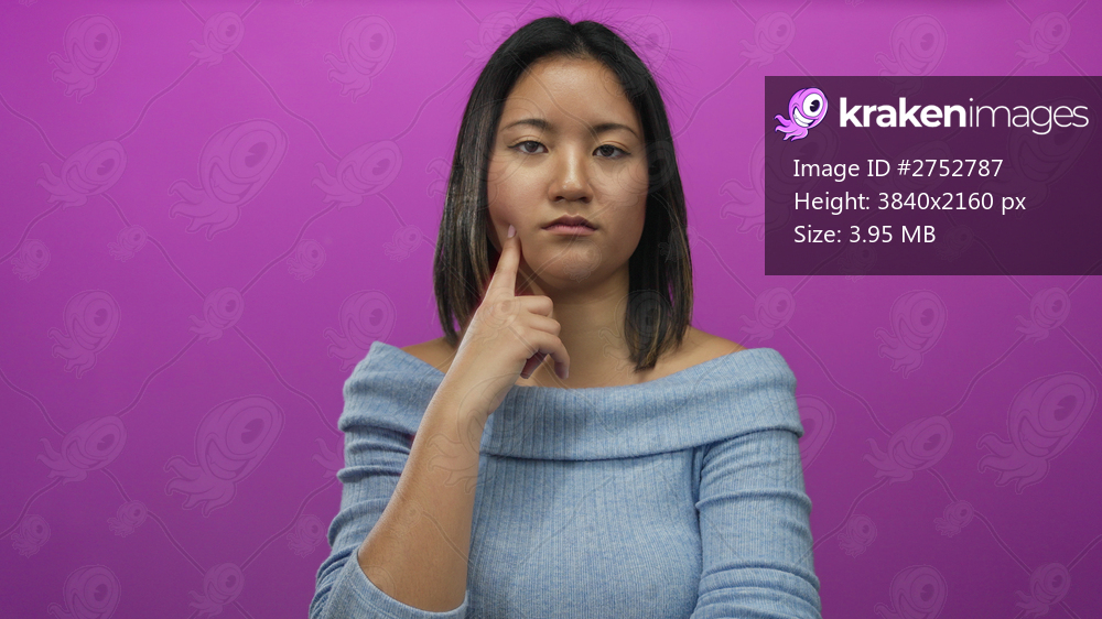 Woman thinking against a bright pink wall wearing a blue sweater depicting contemplation and expression on an isolated background.