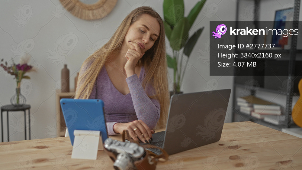 Woman thinking at home with tablet and laptop in living room featuring bookshelves, plants, and modern decor, wearing purple shirt and long hair.