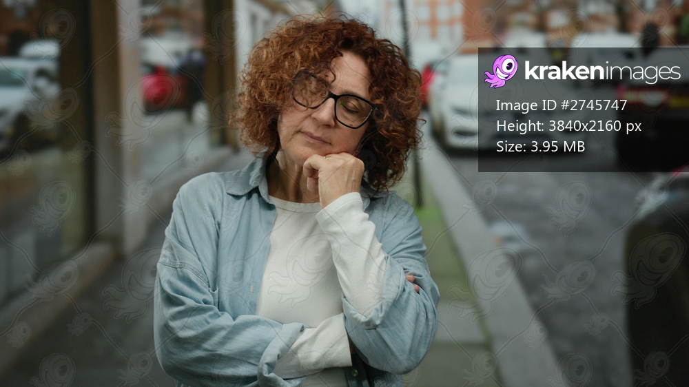 Woman thinking deeply in urban setting with glasses, curly hair, street background, city life, outdoors, reflective pose, thoughtful expression, middle age, day, casual attire.