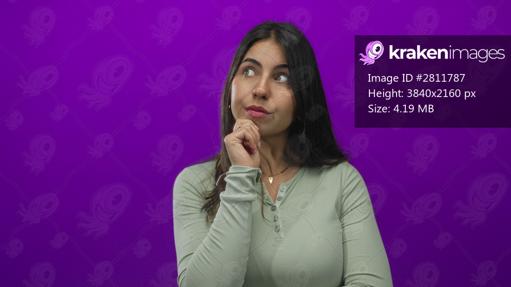 Woman thinking expression with hand on chin against a vibrant purple background highlighting curiosity and contemplation in an isolated environment.