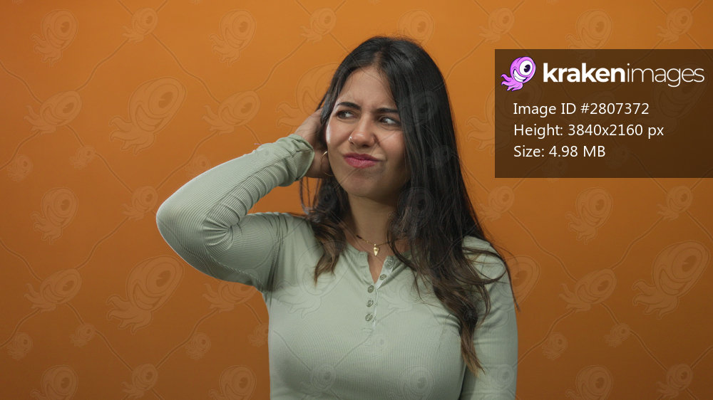 Woman thinking expression with hand on head, dressed casual against an orange background, conveying confusion and contemplation