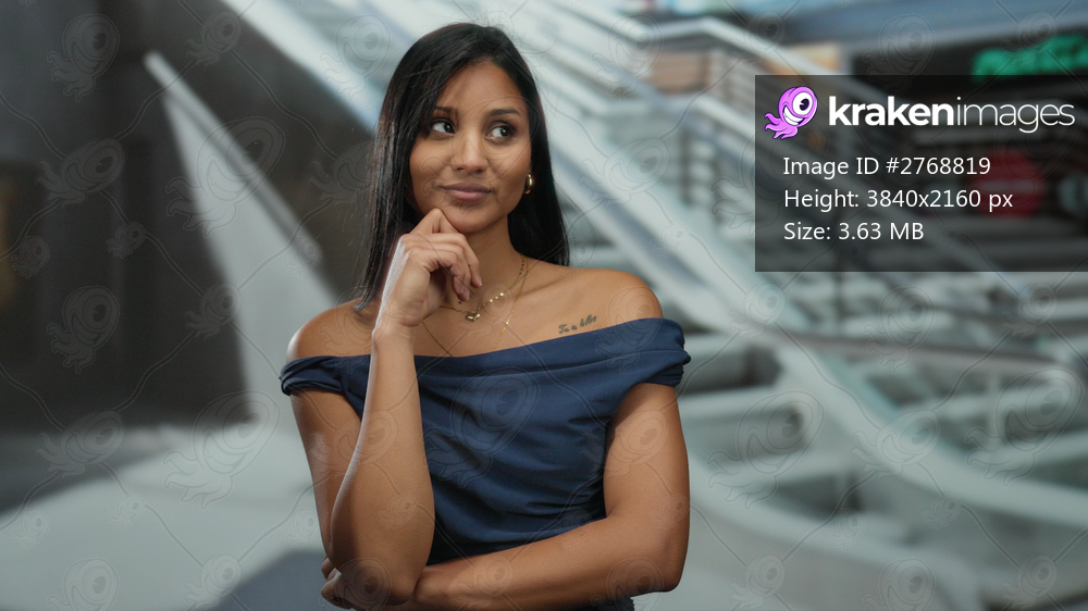 Woman thinking in a stylish dress at a bustling mall center, embodying youthful elegance and modern fashion amidst the vibrant indoor shopping atmosphere. - Kraken Images