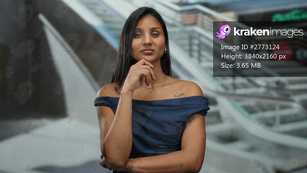 Woman thinking in a stylish dress at a bustling mall center, embodying youthful elegance and modern fashion amidst the vibrant indoor shopping atmosphere. - Kraken Images