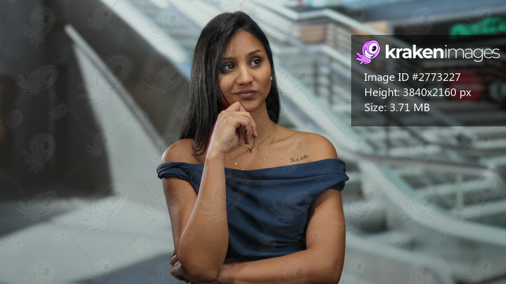 Woman thinking in a stylish dress at a bustling mall center, embodying youthful elegance and modern fashion amidst the vibrant indoor shopping atmosphere. - Kraken Images