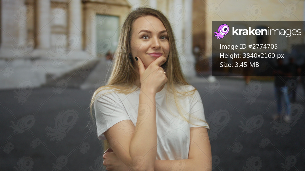 Woman thinking in old town street with historic buildings, wearing casual white t-shirt, outdoors, daytime, thoughtful expression in urban setting, young blonde woman in city. - Kraken Images