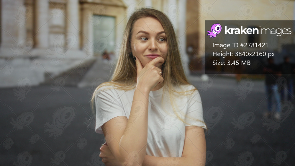 Woman thinking in old town street with historic buildings, wearing casual white t-shirt, outdoors, daytime, thoughtful expression in urban setting, young blonde woman in city. - Kraken Images