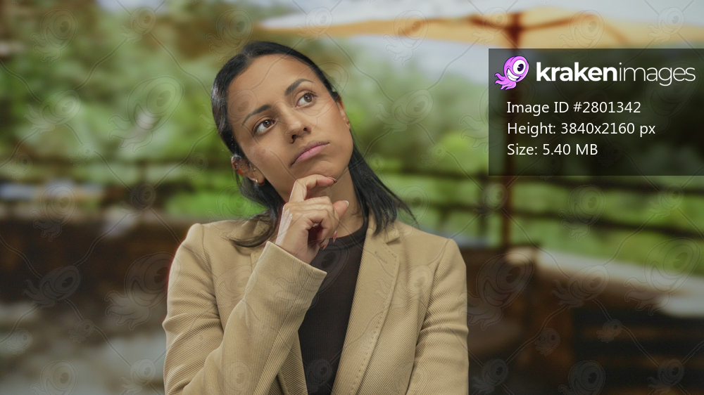 Woman thinking outdoors at a restaurant terrace on a sunny day with green trees in the background wearing a beige jacket with a focused expression on her face - Kraken Images