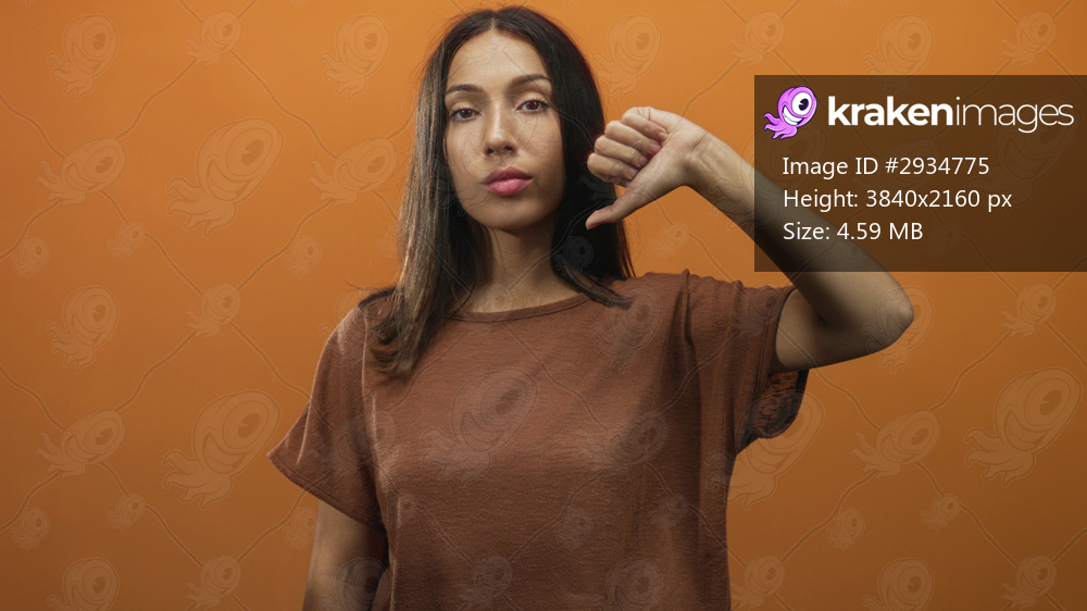 Woman with thumb down gesture and hand near face in orange studio portrait, medium shot; disapproval.