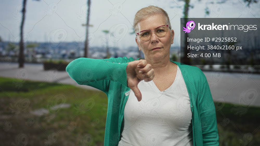 Woman with thumb down gesture on a street promenade near boats and palm trees; disapproval dissent.