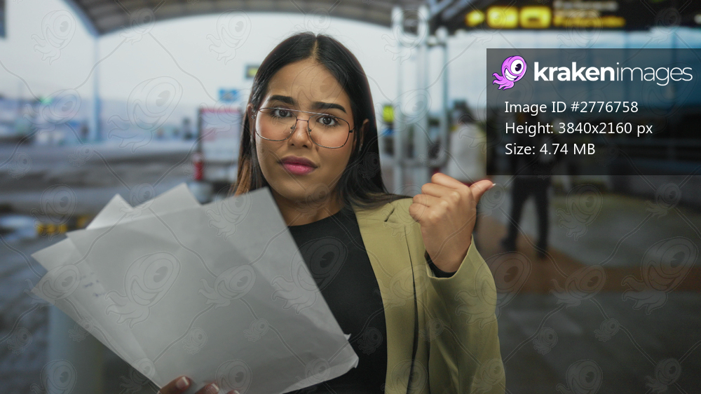 Woman with thumb proudly pointing toward airport gate while young latin hispanic passenger in terminal holds documents looking confused.