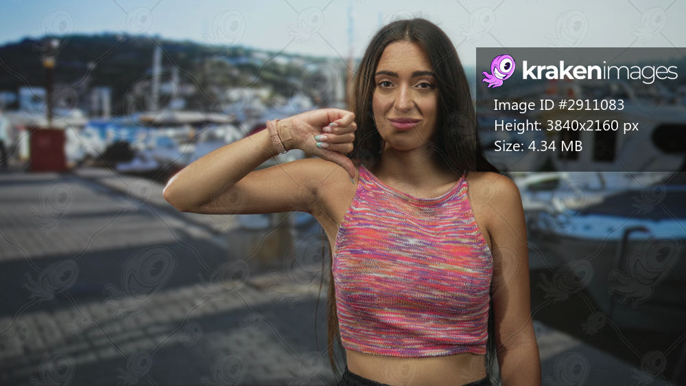 Woman with thumbs down gesture and exposed midriff at port marina pier beside moored boats on sunny seaside promenade; dissatisfaction.