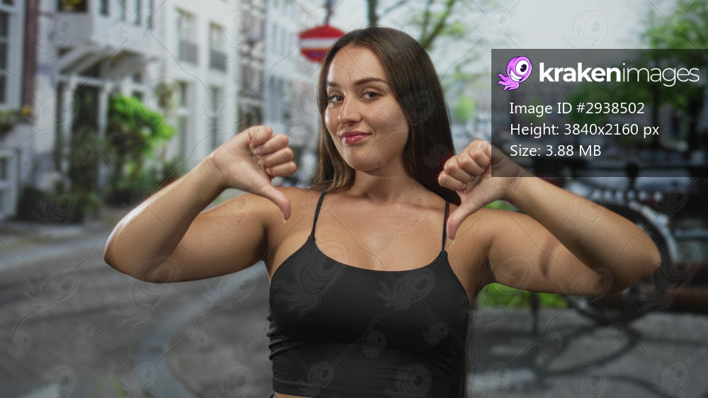 Woman with thumbs down gesture showing bare arms and shoulders, wearing a black tanktop on a city street with bicycle and buildings visible; rejection. - Kraken Images