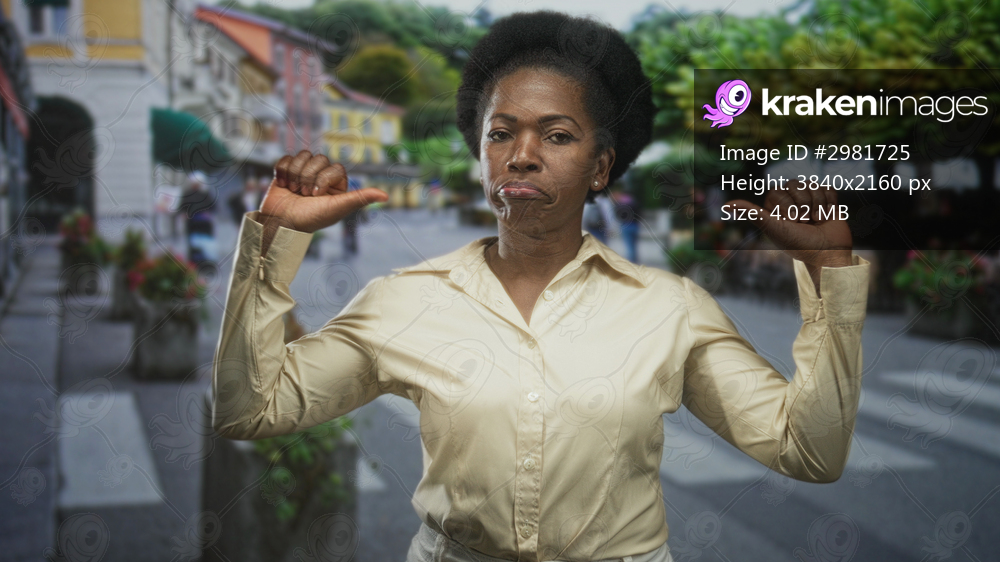 Woman with thumbs pointing to chest on a street crosswalk, wearing beige shirt near outdoor cafe tables and planters in an urban plaza; confidence empowerment. - Kraken Images