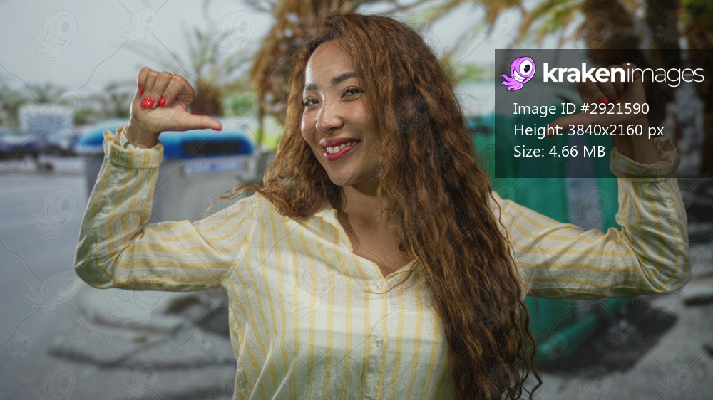 Woman thumbs pointing to chest on street by recycling container and bin, smiling with red nails and striped yellow shirt; confidence empowerment.