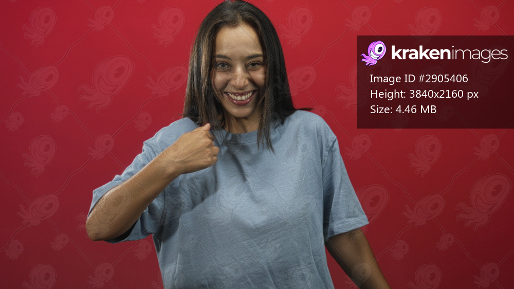 Woman thumbs pointing to chest tugging blue t shirt in studio with red background; confidence self expression.