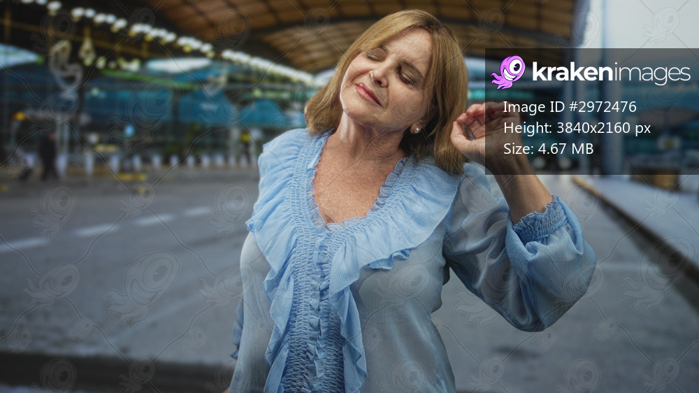 Woman tilting head with eyes closed and raised hand at airport terminal curb wearing light blue ruffled blouse; calm contentment.