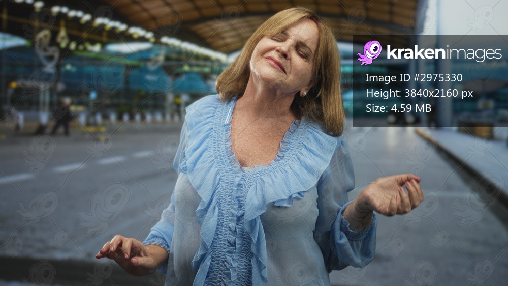Woman tilting head with eyes closed and raised hand at airport terminal curb wearing light blue ruffled blouse; calm contentment.