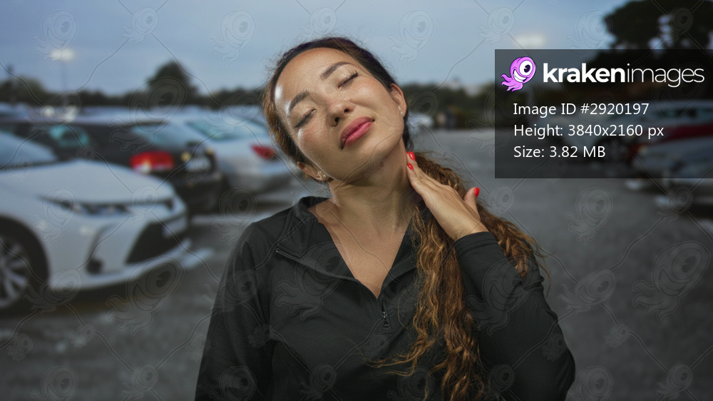 Woman tilting head with face up, hand brushing long hair by parked cars on street during dusk; serenity.