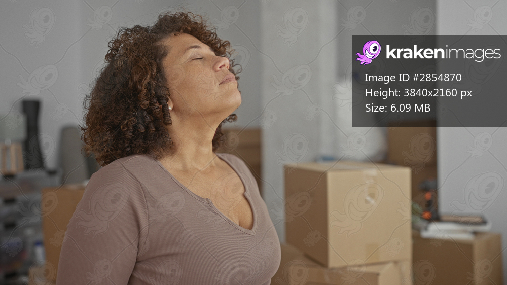 Woman tilts head back among scattered cardboard moving boxes in her bright new house interior; serenity calm relief peace.