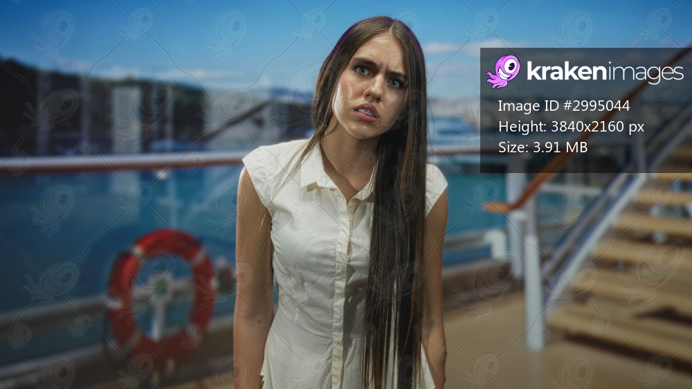 Woman tilts head and leans forward, long hair over white sleeveless dress, life ring and deck stairs visible on ship; defiance.