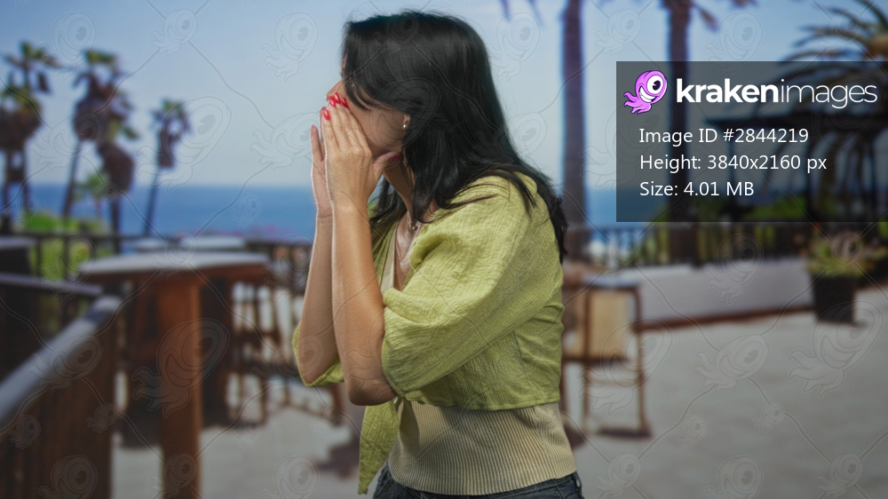 Woman tilts head slightly and shrugs shoulders with arms resting on railing by building; indifference.