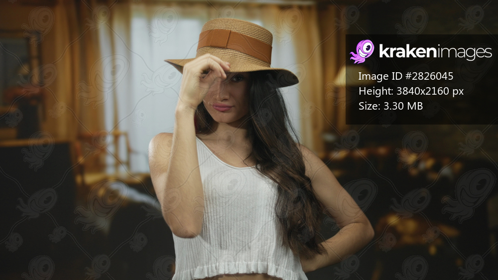 Woman tips straw hat brim while wearing a white tank top and letting long dark hair fall over her shoulder in a building; playfulness.