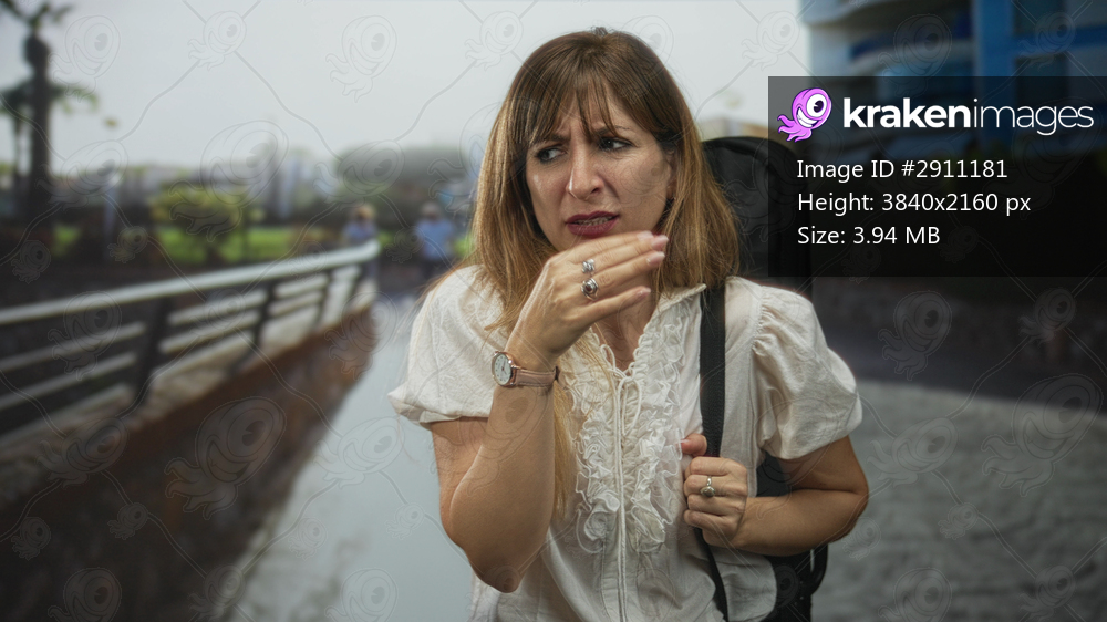 Woman with tongue out, grimacing and holding a backpack strap while waving one hand on a city street near a metal railing; disgust.