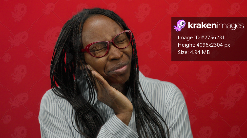 Woman with toothache expression wearing glasses against red wall background displays emotion with hand on cheek.