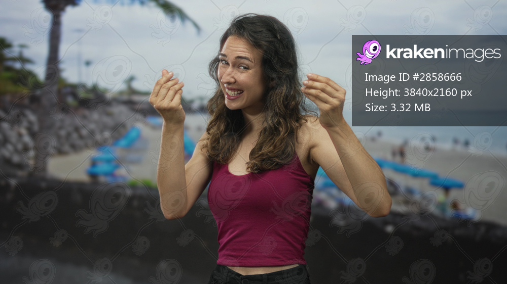Woman tossing banknotes with both hands while smiling broadly and showing palm gesture on street; extravagance.