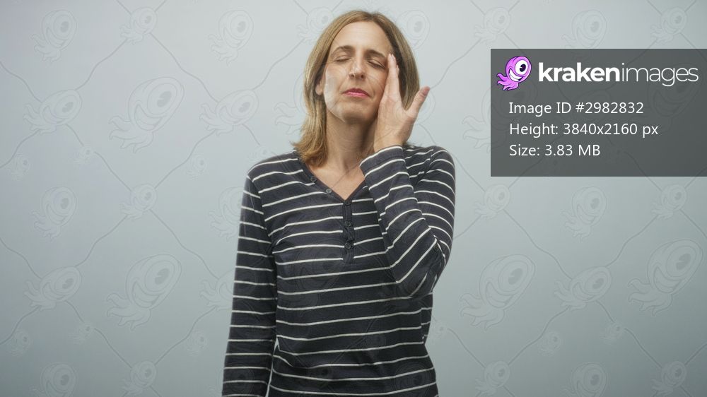 Woman touches cheek with hand in studio wearing striped long sleeve shirt, eyes closed and slight smile standing against plain grey backdrop; self care serenity. - Kraken Images
