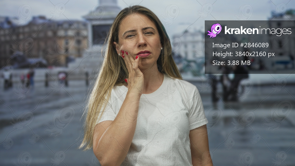Woman touches cheek with hand while wincing during a midday stroll on a busy shopping street near a fountain; pain toothache discomfort soreness.