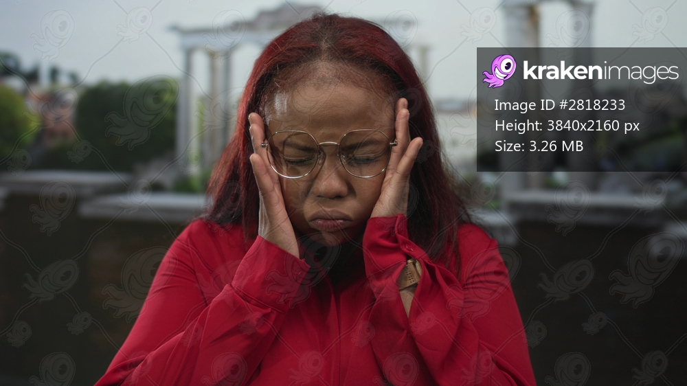 Woman touches cheek in pain at roman ruins building among ancient columns outdoors in red shirt; discomfort.