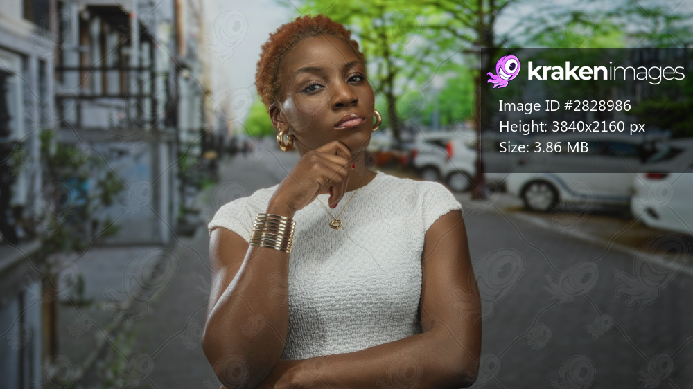 Woman touches chin with finger in street framed by parked cars and green leafy trees lining city sidewalk; contemplation.