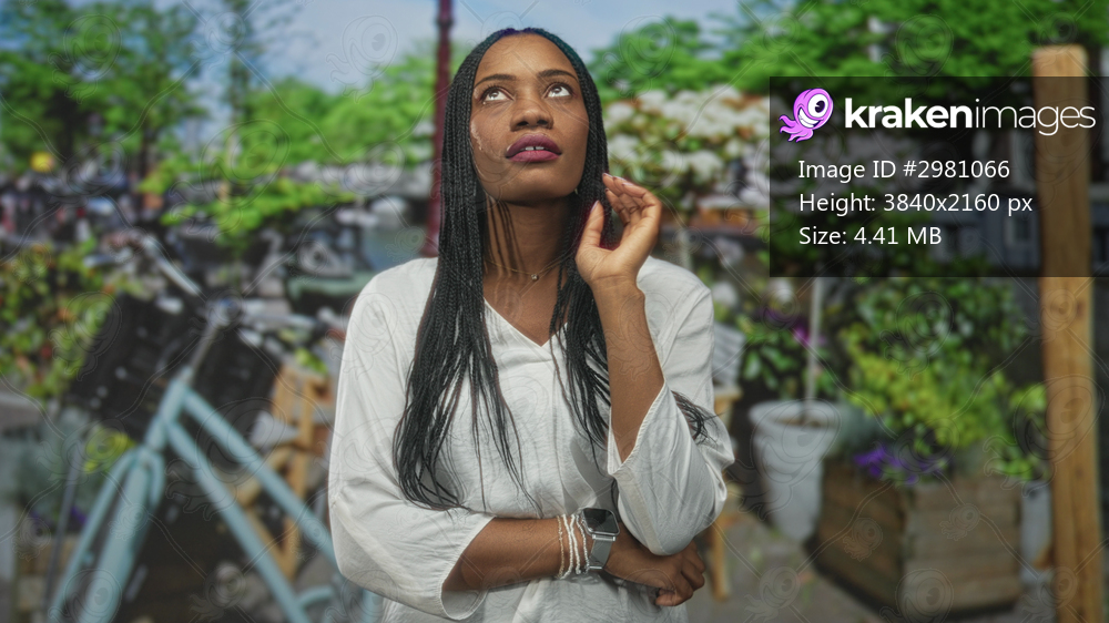 Woman touches chin with hand next to bicycle on street wearing white blouse and bracelets; serenity.
