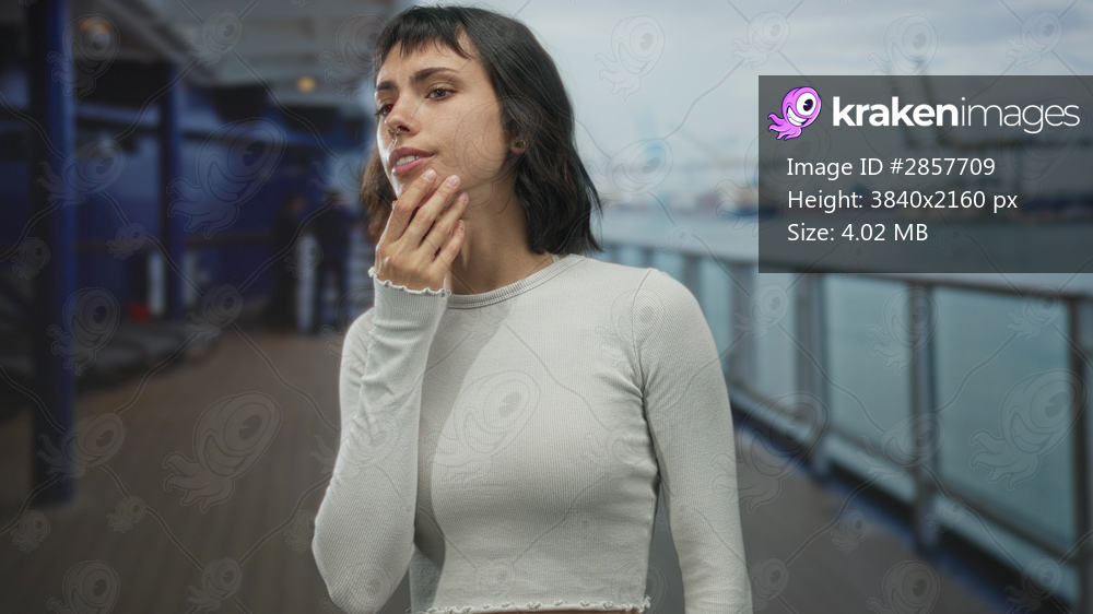 Woman touches chin with hand while standing on sunny boat deck overlooking harbor water; quiet introspection.