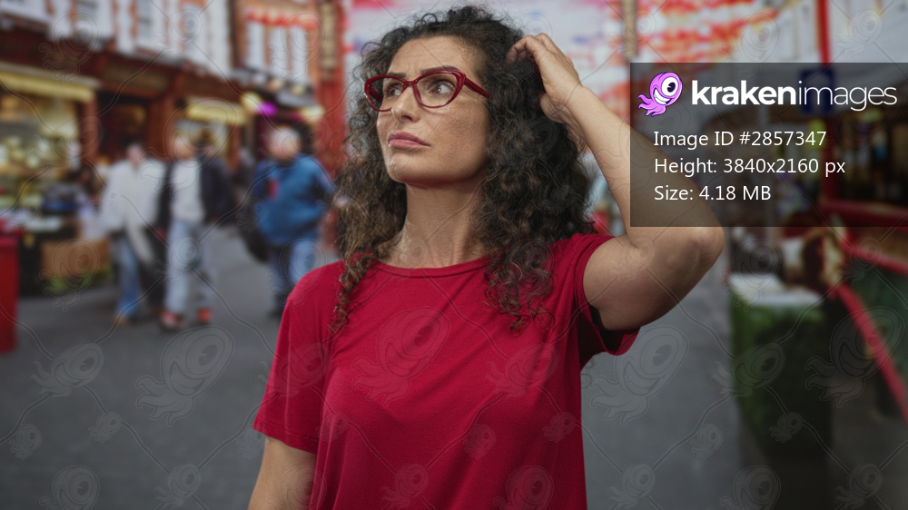 Woman touches curly hair on busy street lined with shops and lanterns amid festive decorations; uncertainty thought.