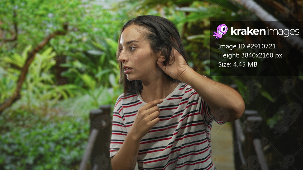 Woman touches ear and points finger to neck in park walkway by green foliage; curiosity self check reflection.