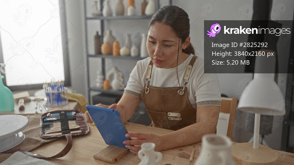 Woman touches forehead while viewing tablet surrounded by pottery tools and vases on wooden table in workshop; creative frustration.