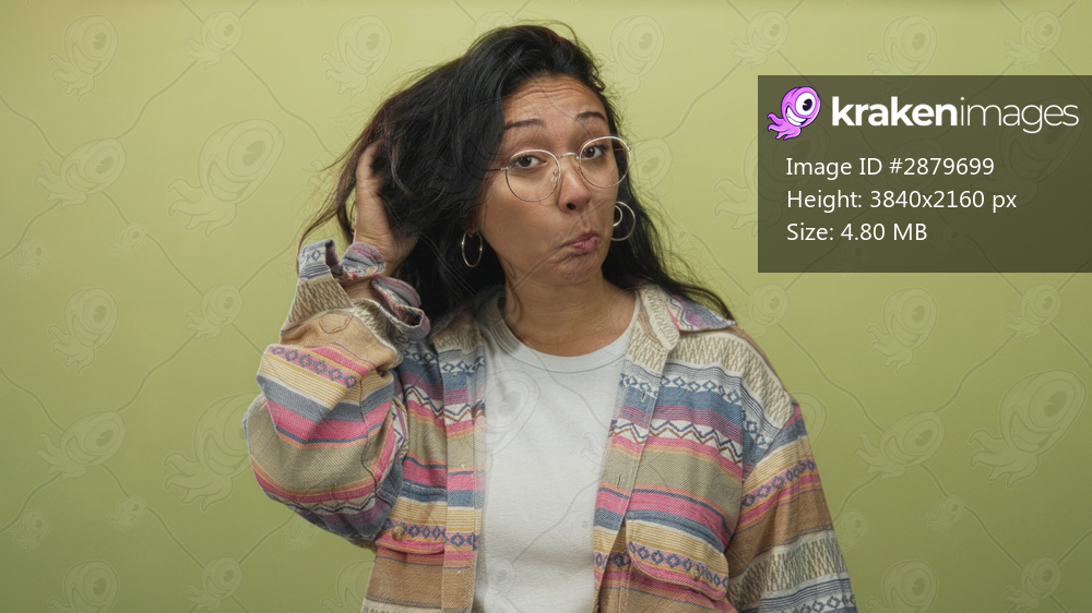 Woman touches hair with hand while wearing glasses and hoop earrings in a light olive green studio; doubt introspection.