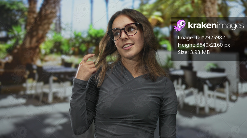 Woman touches hair with her hand on a street restaurant terrace outdoors, wearing glasses and smiling while glancing aside; thoughtful moment.