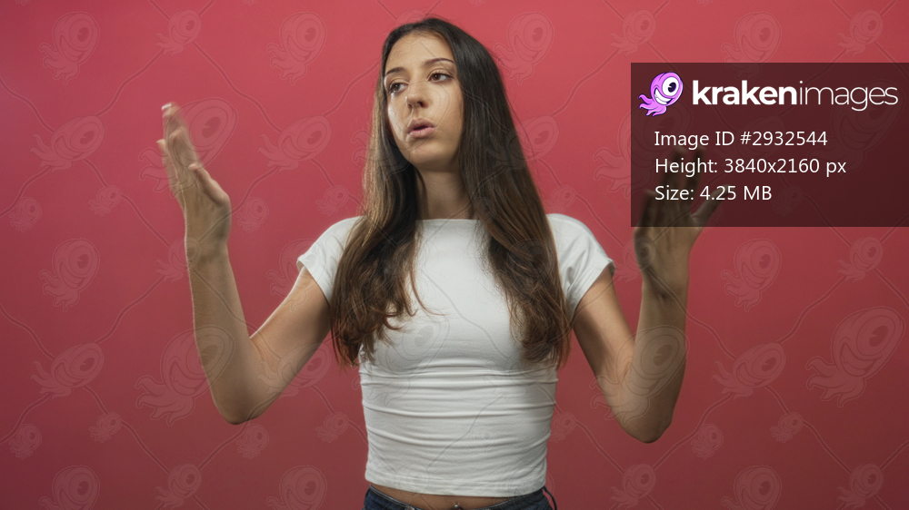 Woman touches hair and raises hands in a pink studio set, wearing a white crop top and long brown hair framing her face; grooming confidence.