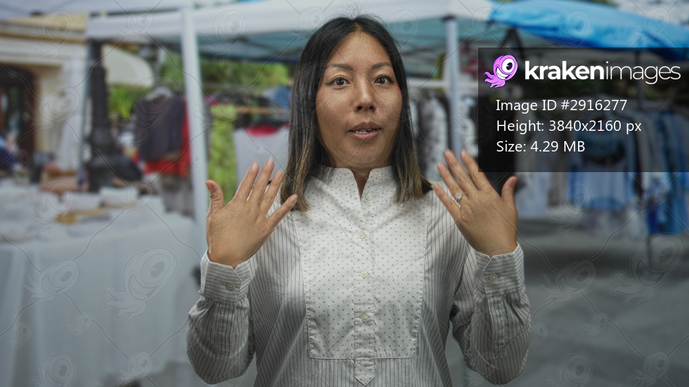 Woman touches hair and shows bare hands with ring at street market stall wearing striped blouse and casual shirt; confidence community.