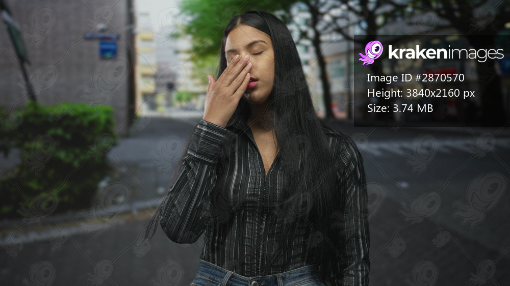 Woman touches hair while standing on street in front of urban buildings while crossing a crosswalk; calm confidence poise serenity.